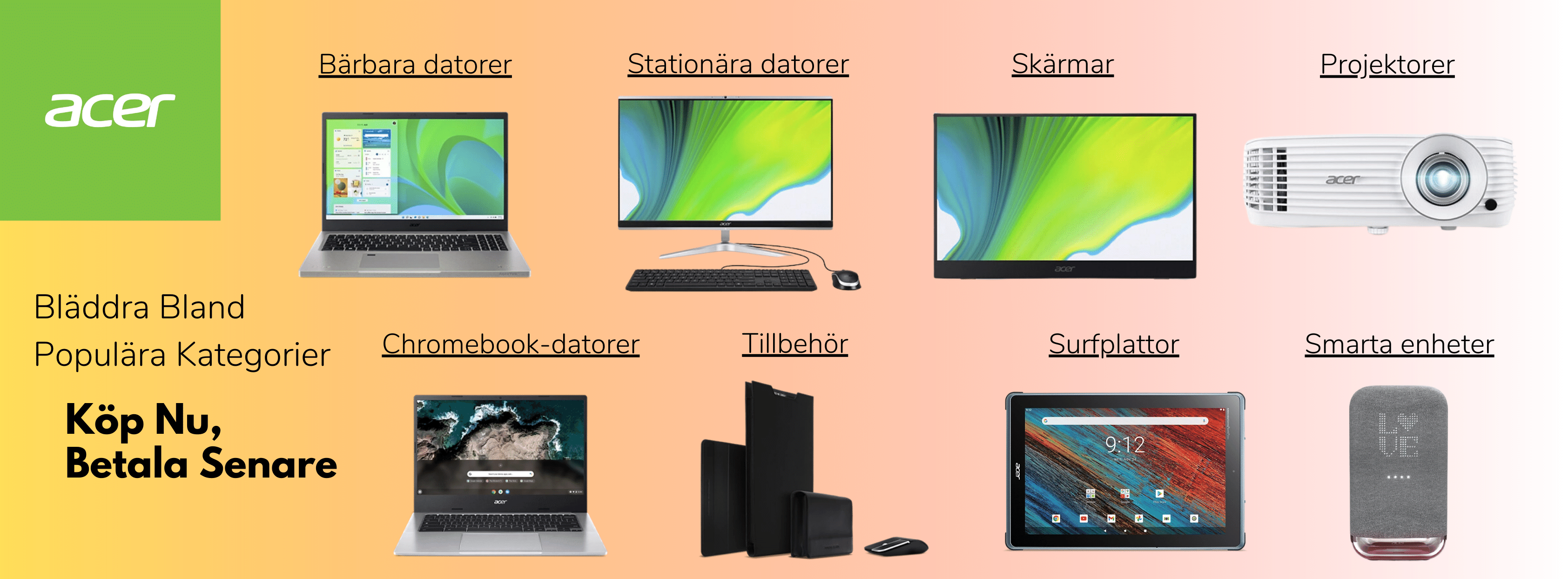 Handle de nyeste Acer-produktene, fra Chromebooks, bærbare datamaskiner, skjermer, stasjonære datamaskiner og projektorer for kontor, hjemme og underholdning.